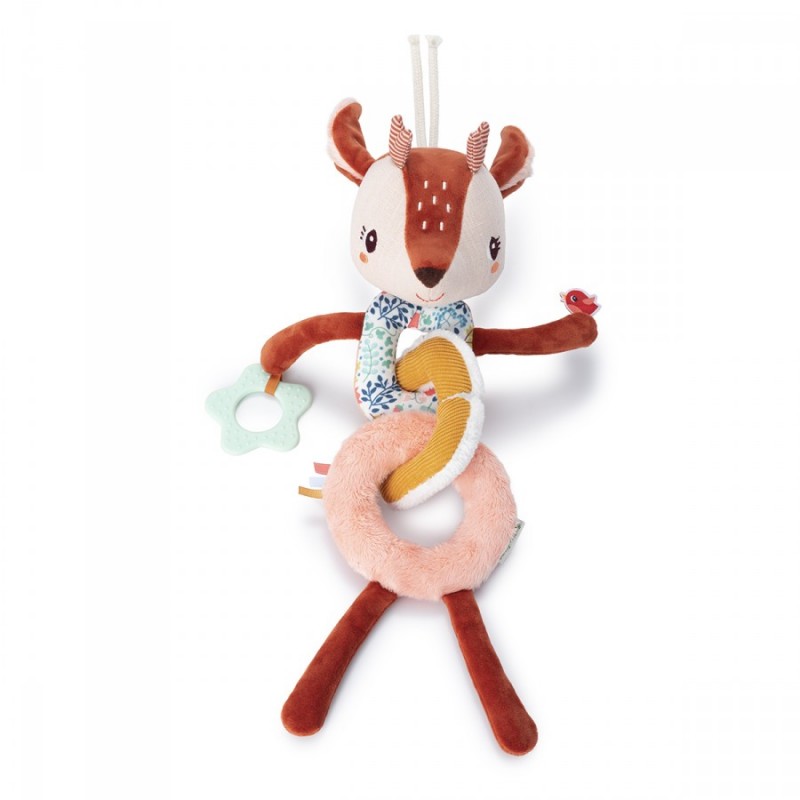 Un jouet d'éveil où les 5 sens sont stimulés. Une cordelette qui permet de l'accrocher où vous vouler. Du toucher, du son , de la vue et du gout puisqu'il y a un anneau de dentition ,pour soulager les gencives de bébé. Un cadeau parfait.Age : 6 mois et +